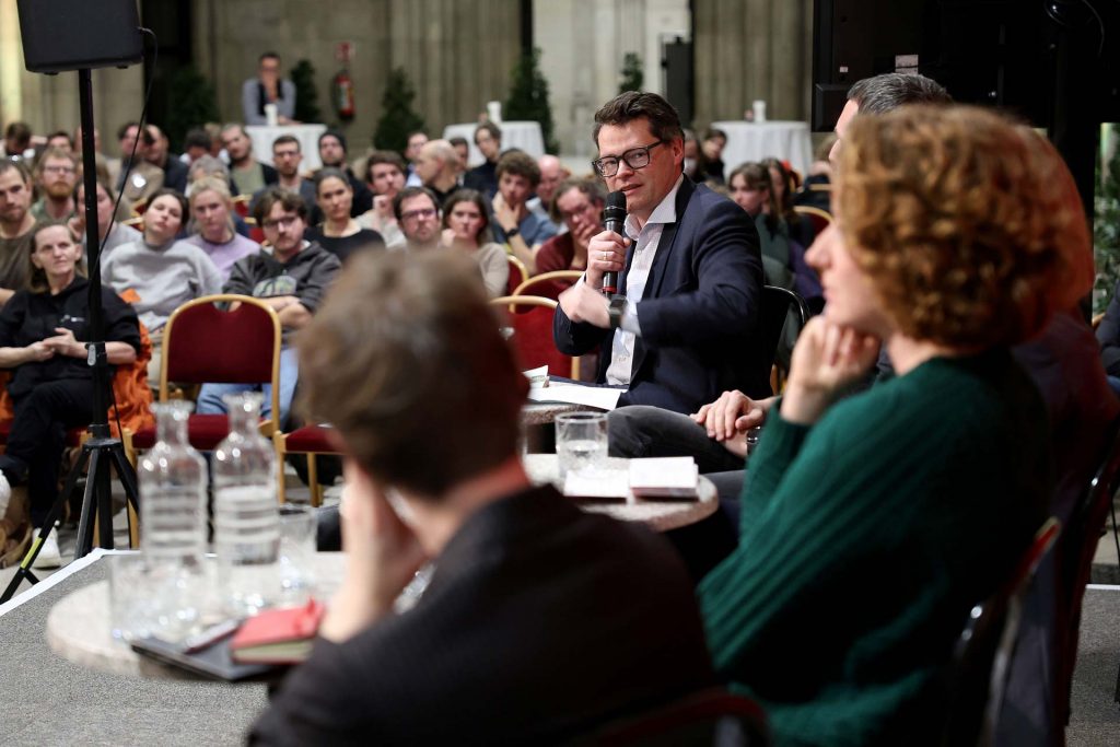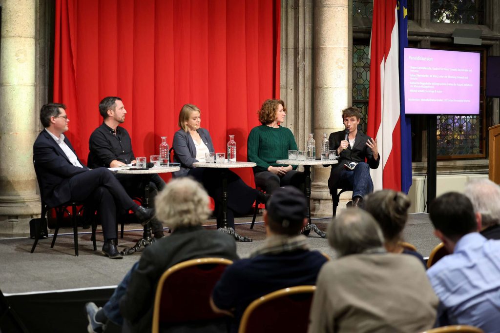 In der anschließenden Diskussion sprachen Klimastadtrat Jürgen Czernohorszky, Lukas Oberndorfer (Leiter der Abteilung Umwelt und Verkehr der AK Wien), Katharina Rogenhofer (Mitbegründerin von Fridays for Future und Initiatorin des Klimavolksbegehrens) sowie Nikolaj Schultz über die Thesen der Keynote und die Frage, wie eine politisch wirksame ökologische Bewegung entstehen kann.