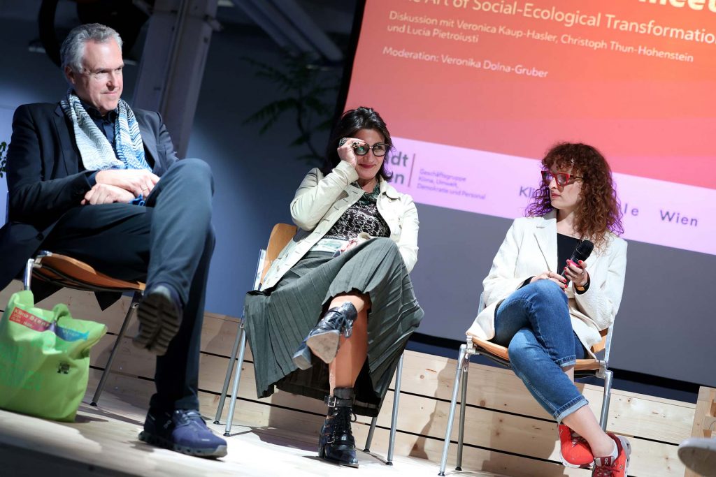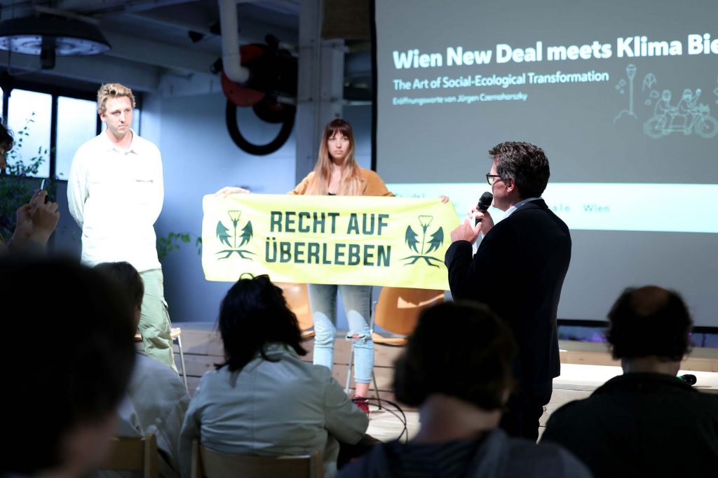 Eine Intervention der letzten Generation unterbrach die laufende Veranstaltung. Anstatt die Unterbrechung als Störung zu sehen, nutzte Jürgen Czernohorszky die Gelegenheit für eine tiefgehende Diskussion mit den Aktivist:innen. Dieser Dialog zeigte, wie essenziell das Thema und der Austausch zwischen unterschiedlichen Akteur:innen ist – von Wissenschaft, Politik und Kunst bis hin zu aktivistischen Bewegungen.